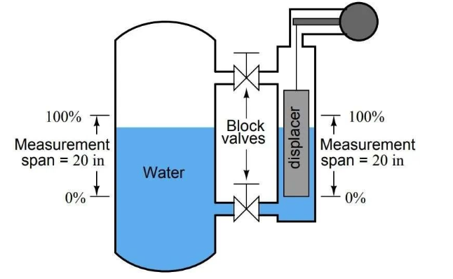 随着液位增加,浮筒杆受到更大的浮力,使得传感仪器显得更轻,传感仪器将重量损失解释为液位上升并传输成比例的 O/P 信号。