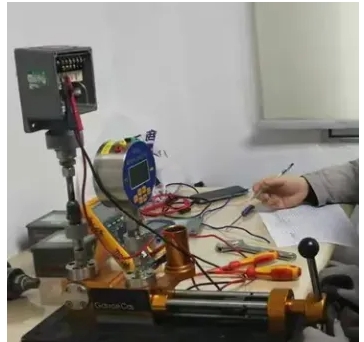2.将标准表和被校压力开关垂直装在效验台上,在接头处放上垫片用扳手固定,先装被效验的开关,再装标准表,装上后稍微加压看接头处是否有漏油。把万用表打到通断档并接到开关的接点上,根据现场使用要求大于接常开、小于接常闭。