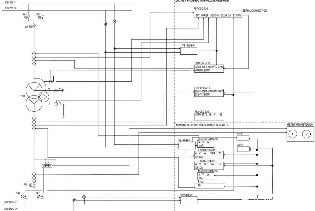 保护主接线图,图纸上是某国一个站变压器间隔,变压器的高压侧无PT。使用90k母线电压与225kv母线电压实现捡同期合闸变压器高压侧断路器dj。