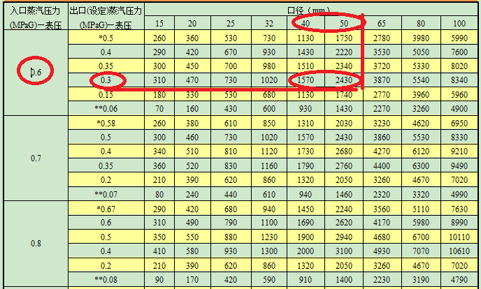 当入口压力6Barg,减压至3Barg时,DN40减压阀最大额定量为1570KG/H。DN50最大额定量为2430KG/H。