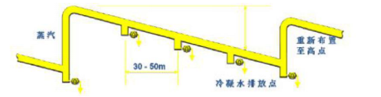 每隔30~50m 设一个疏水点,并配以尺寸合适的集水井。让冷凝水顺利的陷落到集水井的空间内,然后通过疏水阀及时排出。