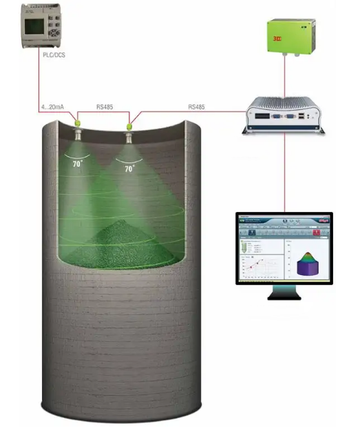 特点:多点扫描模式、多点测量、形成上千个网格点对每一个网点进行分析采集,对料位的全方位覆盖,更加准确的显示实际料位。
