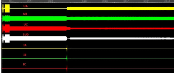 下图是整个故障过程的录波图。因为故障过程很长,波形被横向压缩了。