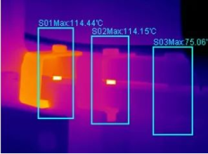 上图为变压器套管末屏发热的情况。变压器套管末屏在安装时如果没有安装到位,会在运行中放电、发热,如果长时间不处理可能会造成事故。但运行中的变压器不方便进行实际设备的检查,而红外测温可以有效进行识别。