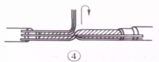 ⑤接着把这两股芯线按顺时针方向紧缠2圈后,再折回90° 并平卧在折起前的轴线位置上。