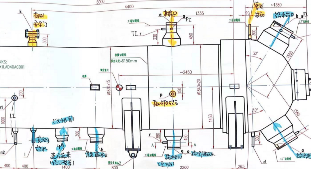 机组运行过程中,2、4 级抽汽首先分别进入 2号、4号高加前置冷却器,充分利用抽汽过热度来提高给水温度,经放热后的过热蒸汽再分别进入2号和4号高加,因此2号、4号高加前置冷却器在正常运行状态下无疏水产生,在启动及事故工况下的疏水通过U型水封的型式进入2A和4B高加。因此,从外观上来看,2A高加和4B高加的底部共有3根疏水管道,比其余高加均多出一根管道,分别对应正常疏水管道、危急疏水管道和高加前置冷却器的疏水管道,2号、4号前置冷却器至高加的疏水管道上没有任何阀门,如下图所示。