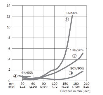 虽然ZPY-VB系列这款漫反激光传感器测量距离算短距离的,但反射比也受到触发感应距离背景颜色的影响,黑色的触发感应距离反射比最差,只有百分之六,白色的触发感应距离反射比最好,有百分之九十。